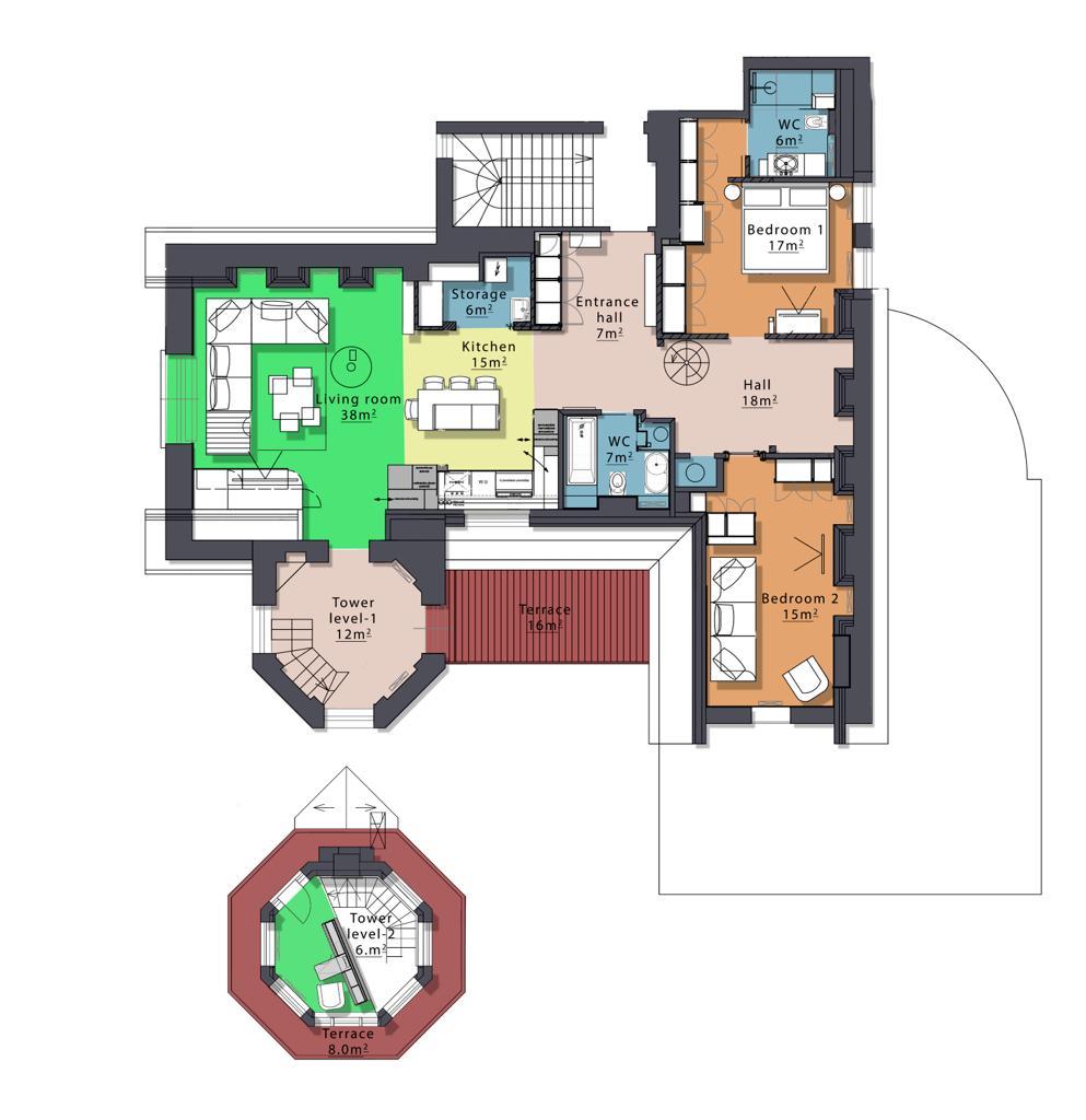 Kopējā platība 171m2, kas sastāv no dzīvojamās platības 147m2 un terases 24m2.
